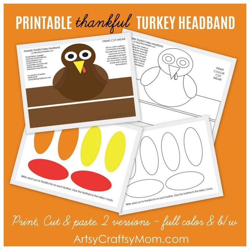 Create your own Turkey Paper Headband. Print, cut & glue. Printable PDF in full color & Black & White. Write what you’re thankful for on each feather. Glue the feathers to the turkey’s body.