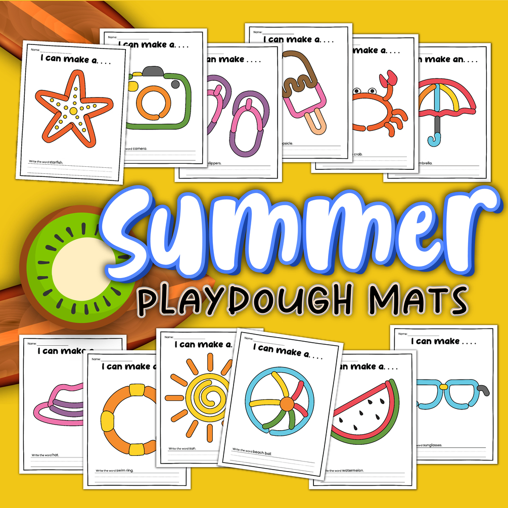 The set comes with twelve 8.5 x11 full color & b/w, Summer Themed Playdough Mats